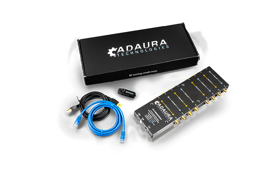 The AD-USB8AR38G95 is Adaura Technologies’ latest design in the AD-USB series of programmable RF attenuators. Combining all the best features of the previous models, the R3 is the new series flag ship. With a completely custom machined aluminum enclosure, the AD-USB8AR38G95 boasts 95dB of attenuation with over 110dB of interchain isolation. The addition of Ethernet allows EASY implementation into the most modern of test setups by allowing network control via HTTP web interface or direct Telnet while the USB port powers the device and allows for serial and HID communication. Optional Power Over Ethernet (POE) can be configured to the device.